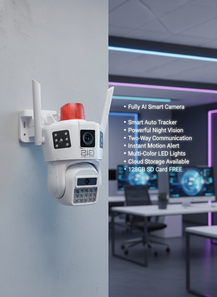 Experience next-level protection with our Fully AI Smart Security Camera. It features real-time AI motion detection, Smart Auto Tracking, powerful Night Vision, Two-Way Communication, instant alerts, and 360° full-area coverage.